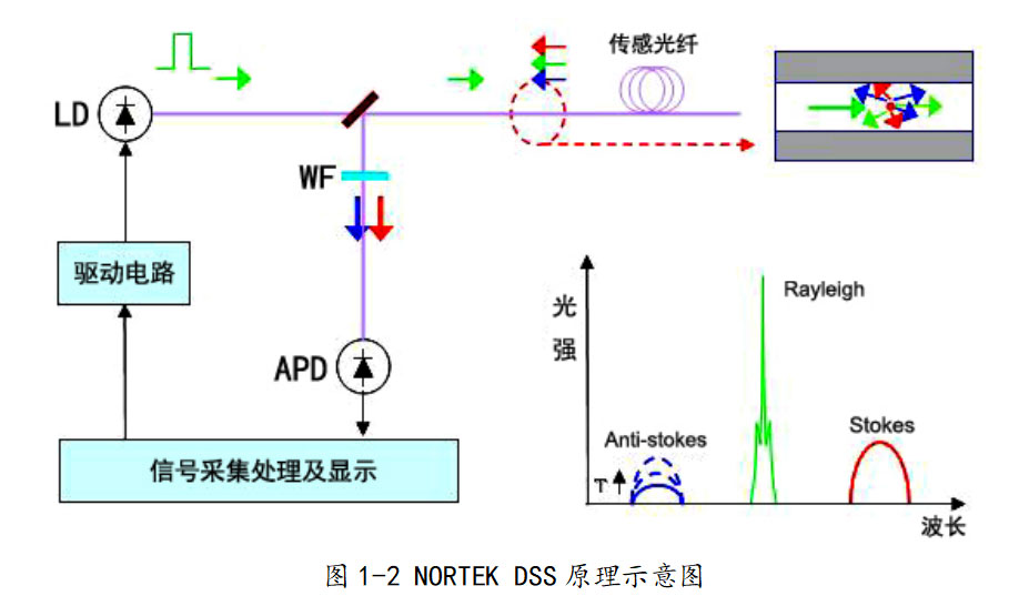 NORTEK DSS的温度测量基于自发拉曼Raman散射效应。大功率窄脉宽激光脉冲LD入射到传感光纤后,激光与光纤分子相互作用,产生极其微弱的背向散射光,散射光有三个波长,分别是Rayleigh(瑞利)、anti-stokes(反斯托克斯)和stokes(斯托克斯)光;其中anti-stokes温度敏感,为信号光;stokes温度不敏感,为参考光。从传感光纤背向散射的信号光经再次经过分光模块WF,隔离Rayleigh散射光,透过温度敏感的anti-stokes信号光和温度不敏感的stokes参考光,并且由同一探测器(APD)接收,根据两者的光强比值可计算出温度。而位置的确定是基于光时域反射OTDR技术,利用高速数据采集测量散射信号的回波时间即可确定散射信号所对应的光纤位置。