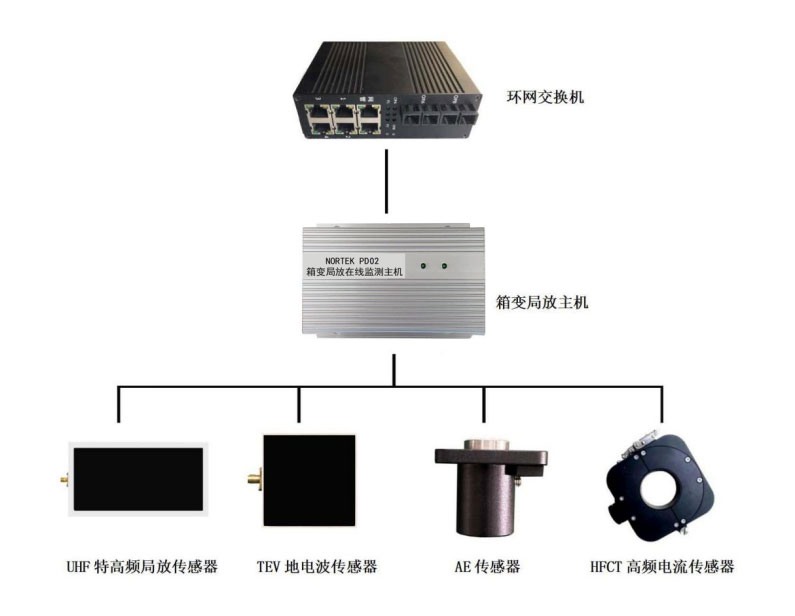 箱变局部放电在线监测系统由监测主机、HUF特高频局放传感器、HFCT高频电流传感器、AE超声局放传感器、TEV地电波局放传感器以及后台诊断分析系统(可选)组成。